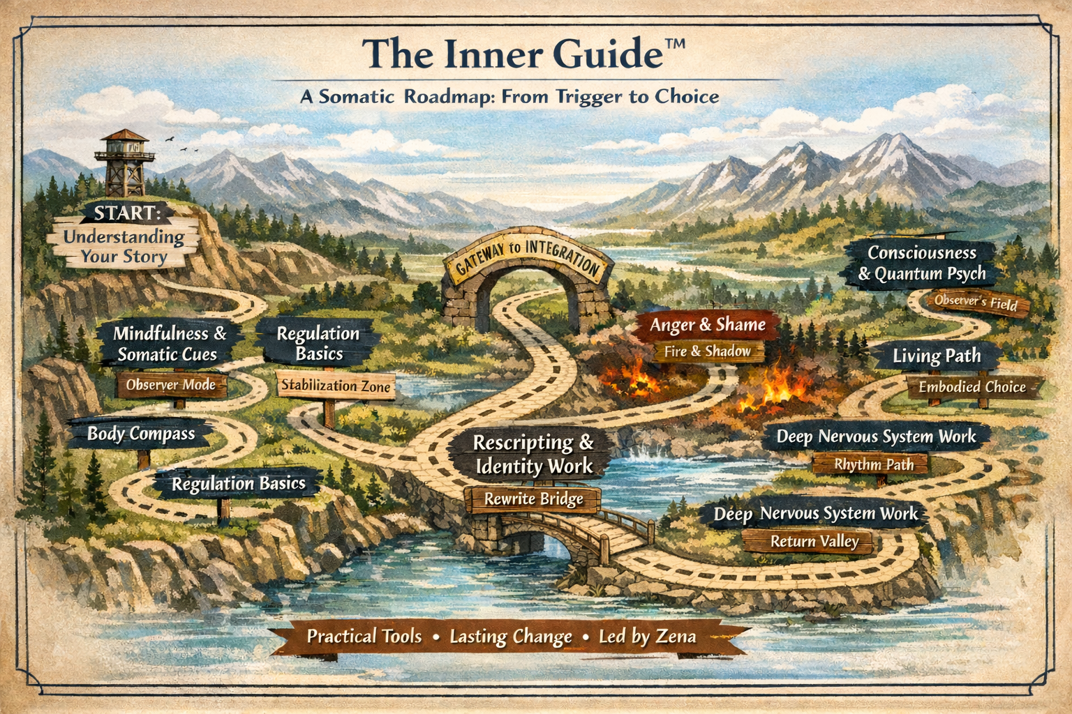 The Inner Guide is trauma-informed and created by a qualified psychotherapist. It is not therapy, but a self-guided framework for building agency, inner authority, and conscious life direction.